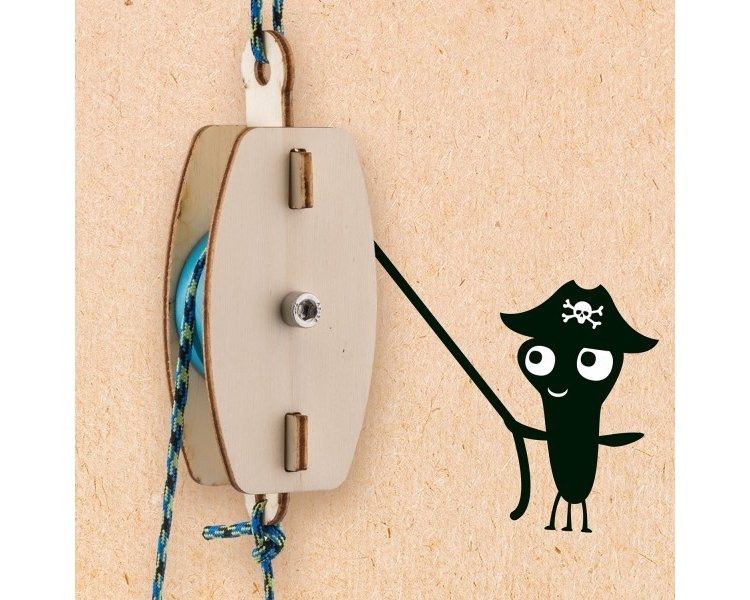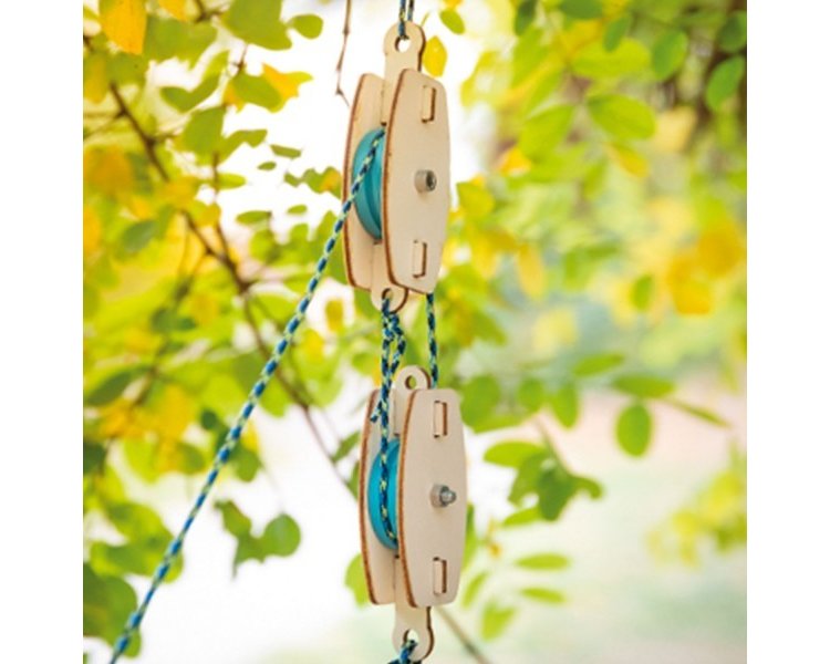 Inhalt: Flaschenzug-Modell aus Holz zum Zusammenbauen, Kunststoffrolle, 2 Metallschrauben, 2 Schraubenmuttern, 3 m blaues Seil, 6 m buntes Seil, große sternförmige Perle, Anleitung (16 S.)