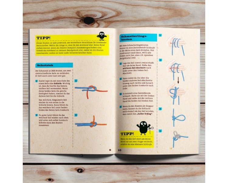 AUSFÜHRLICHE SCHRITT-FÜR-SCHRITT-ANLEITUNG: Das liebevoll gestaltete Anleitungsheft zeigt vom einfachen Überhandknoten bis zum Palstek, alle Handgriffe in leicht verständlichen Bildern