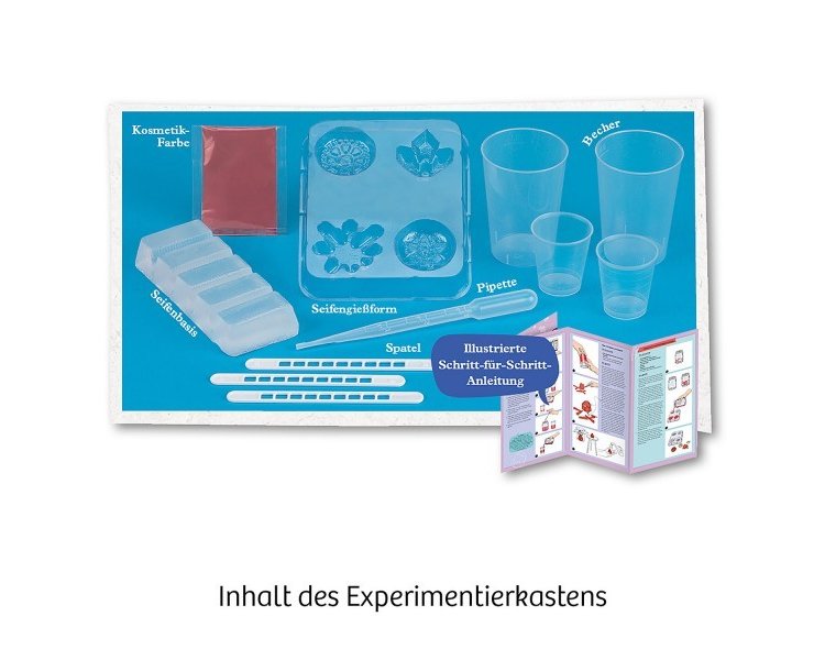 Inhalt: Glycerinseife (100g), Päckchen Farbpulver (rot), 2 große Messbecher, 2 kleine Messbecher, Pipette, 3 Rührspatel, Seifen-Gießform, Anleitung