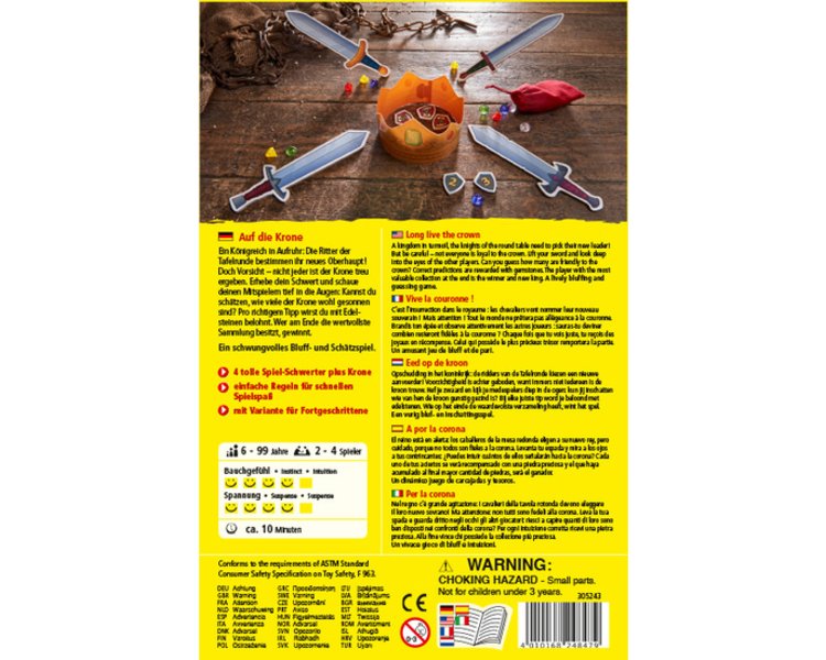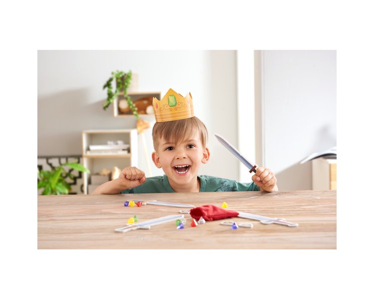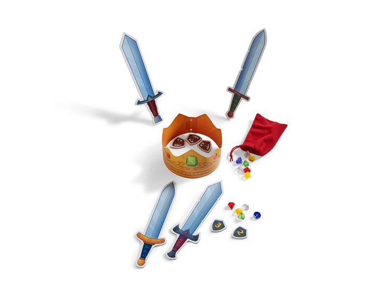 Zu den wichtigsten Talenten eines guten Königs gehört, seine Verbündeten und Untertanen richtig einschätzen zu können. Das zeigt das HABA Kinderspiel Auf die Krone. Wer führt eigensinnige Pläne im Schilde und wer ist der Krone treu? Das gilt es zu beurteilen auf der Suche nach dem neuen Herrscher über das Königreich und dem neuen Oberhaupt der Tafelrunde. In dem spannenden Spiel für Kinder erheben die Spieler reihum ihre Schwerter. Doch Vorsicht – nicht jeder Ritter ist dem Königreich treu ergeben. Geschätzt werden muss, wie viele Mitspieler der Krone wohlgesonnen sind. Richtige Tipps werden mit Edelsteinen belohnt. Der Spieler, der die wertvollste Sammlung besitzt, gewinnt.