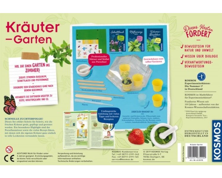 Die altersgerechte Anleitung des Sets führt durch die einzelnen Bereiche – von Pflanzenkunde, über die richtige Pflege bis zur Ernte. Außerdem warten tolle, kinderleichte Rezepte für Pfefferminz-Eistee, Basilikum-Salz und Schnittlauch-Quark auf die kleinen Gärtner. Das Highlight dieses Experimentiersets von KOSMOS: Mit dem hochwertigen Porzellan-Mörser zerkleinern die Kinder ihre geernteten Kräuter. Mmh, wie köstlich es auf der Fensterbank und in der Küche duftet!