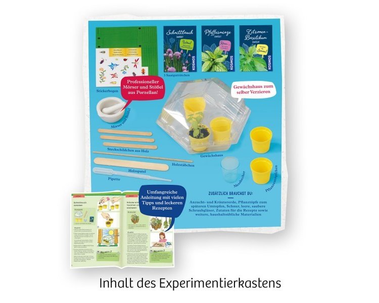 Inhalt: Gewächshaus, Stickerbogen, 5 Pflanzentöpfchen, Saatguttütchen Pfefferminze, Saatguttütchen Zitronenbasilikum, Saatguttütchen Schnittlauch, Porzellanmörser, Porzellanstößel, Holzspatel, Holzstäbchen, Pipette, Messbecher, Steckschildchen aus Holz, Anleitung (16 Seiten)