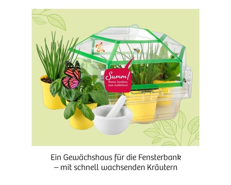 Mit den bunten Insekten-Stickern lässt sich das Gewächshaus individuell verzieren, sodass es zum echten Hingucker wird, wenn Zitronenbasilikum, Schnittlauch und Pfefferminze zu sprießen beginnen.