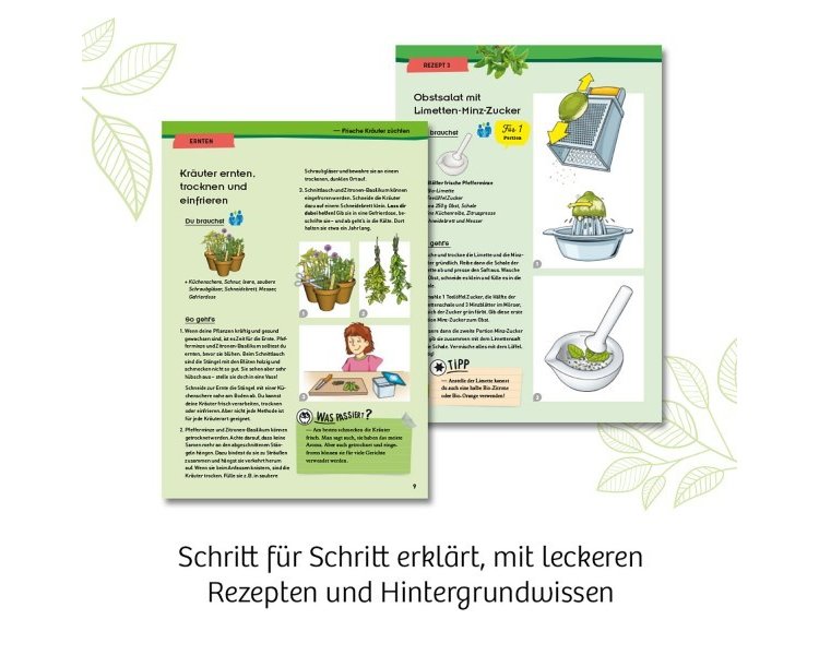 Die altersgerechte Anleitung erklärt Kindern ab 6 Jahren Schritt für Schritt, was zu tun ist: von der Anzucht der schnellwachsenden Kräuter, über die Pflege bis hin zur Ernte.