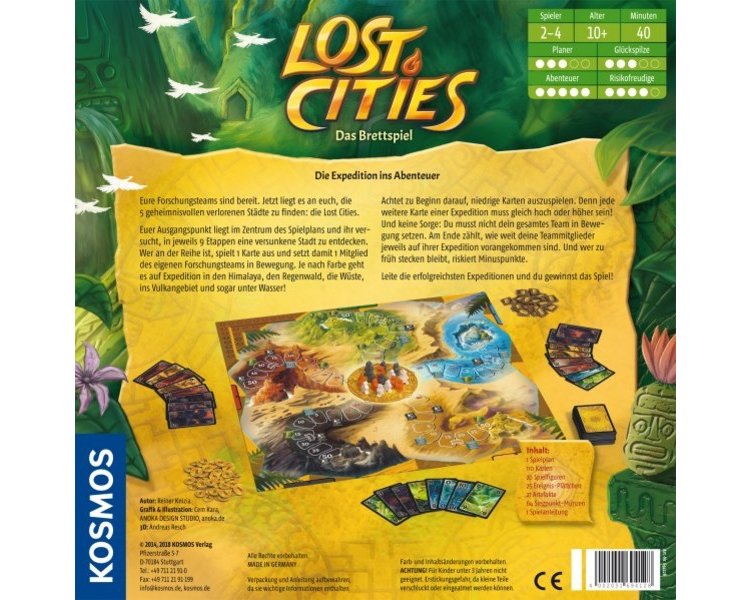 Die Expedition kann starten. Fünf untergegangene Städte gilt es zu entdecken: die Lost Cities. Die Spieler schicken ihre Abenteurer auf unterschiedlichen Pfaden los. Wer wird wohl am Ende der Erfolgreichste sein und den größten Ruhm erlangen?