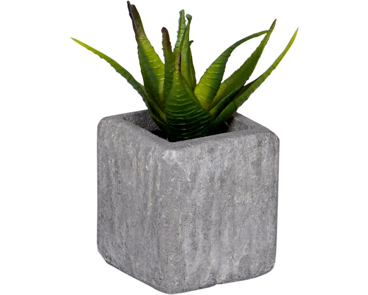 Topf aus Beton und Dekopflanze aus Kunststoff.