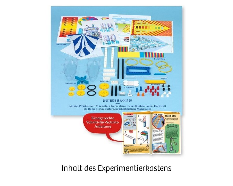 Inhalt: Anleitung, ca. 45 Systemteile: Schaufelrad, Rahmen, Zahnräder, Räder, Kranhaken, Dübelheber usw., Stanz- und Bastelbögen, Fallschirm, Schnur, Trinkhalme, Pipette und weitere Kleinteile