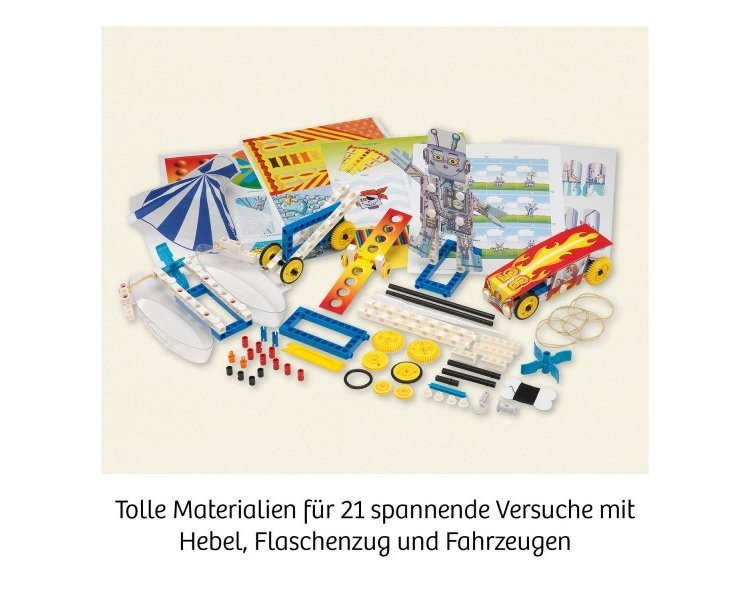 In 21 verblüffenden Versuchen finden sie ganz spielerisch heraus, wie Hebel und Flaschenzüge funktionieren oder was ein Fahrzeug antreibt.