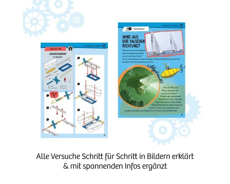 Zu Land, zu Wasser und in der Luft – hier wird Technik spielerisch erforscht. Ein kleines Auto flitzt durchs Zimmer und wird zum Schaufelradboot umgebaut. Ein Papierflieger gleitet elegant durch die Luft und der Fallschirm segelt zu Boden. Aber warum ist er so langsam? Das erklärt die Anleitung!