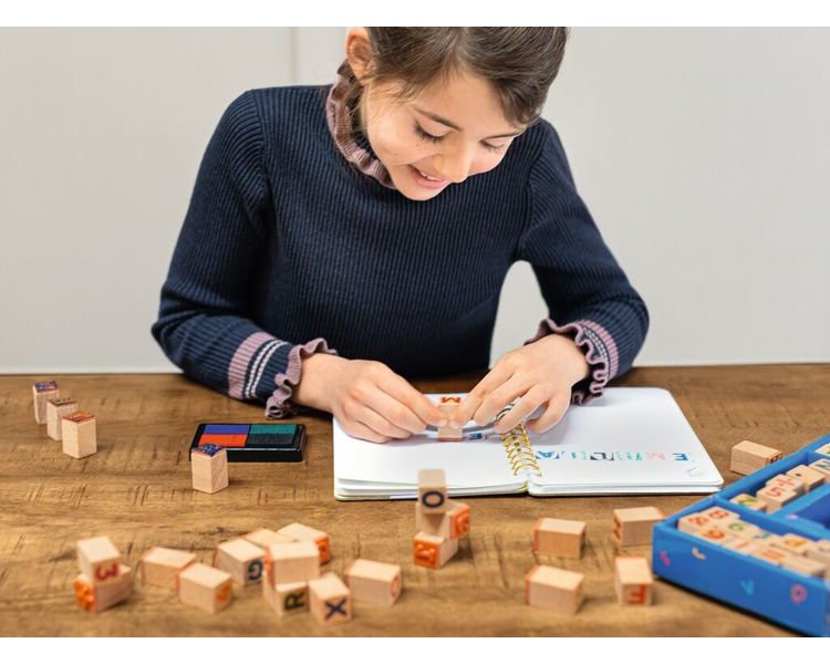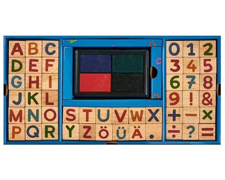 Im Set befinden 48 unterschiedliche Stempel, unter anderem für alle Buchstaben des Alphabets, sowie die Umlaute Ä, Ö und Ü und für Frage- und Ausrufezeichen. Kinder können so ihrer Kreativität freien Lauf lassen und entweder einzelne Wörter, Sätze oder ganze Texte kreieren und gestalten. Ebenfalls im Set enthalten sind Stempel in Form von Zahlen und der Rechenzeichen der vier Grundrechenarten. Dadurch eignet sich das Set nicht nur perfekt für kreative Kunstwerke, sondern auch kleine Rechenübungen.