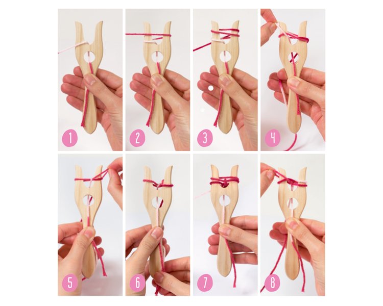 Ausstattung: in Polybag (ca. 16 x 13 x 3 cm) mit Karte / mit 1 Strickgabel aus Kiefernholz, mehrfarbigem Garn (15 g) und 1 Schritt-für-Schritt-Anleitung
