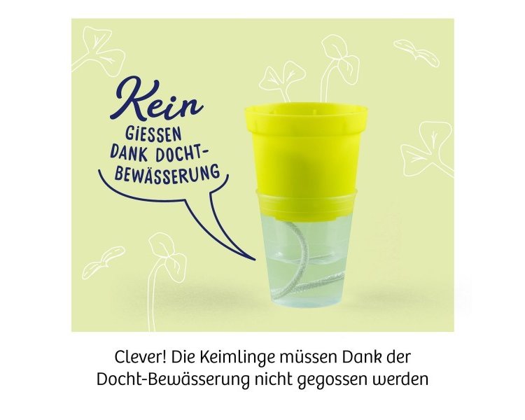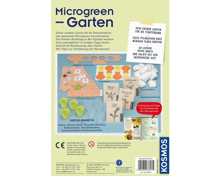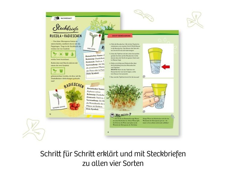 Inhalt: 4 Töpfchen, 4 Wasserresevoirs, 4 Bewässerungsdochte, Samentütchen Kresse, Senf, Rucola und Radieschen a je 5g, 12 Wattebällchen, Kartonaufsteller aus zwei Teilen, Pipette, Stanzteile Abdeckung/Kennzeichnung, farbig illustrierte Anleitung