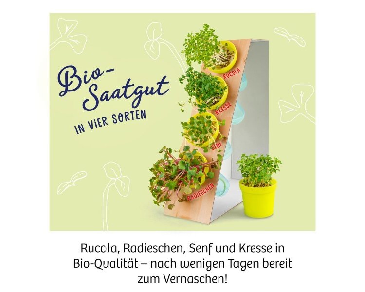 Die vier Sorten Rucola, Senf, Kresse und Radieschen sind schon nach wenigen Tagen erntereif und schmecken auch als Keimlinge richtig lecker - perfekt für Brote und Salate.