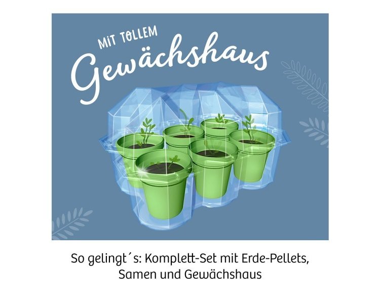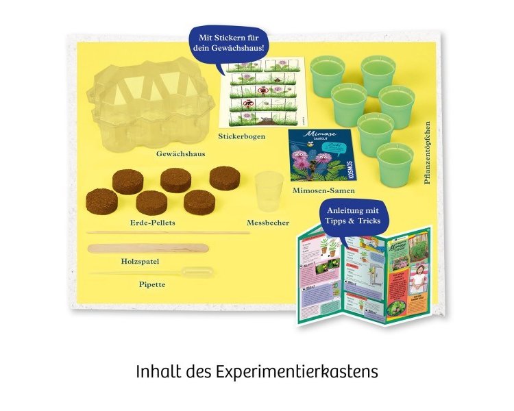 Inhalt: Anleitung, Gewächshaus, 6 Pflanzentöpfchen, 6 Erde-Pellets, 1 Beutel Mimosen-Samen, 1 Pipette, 1 Holzstab, 1 Messbecher, 1 Stickerbogen