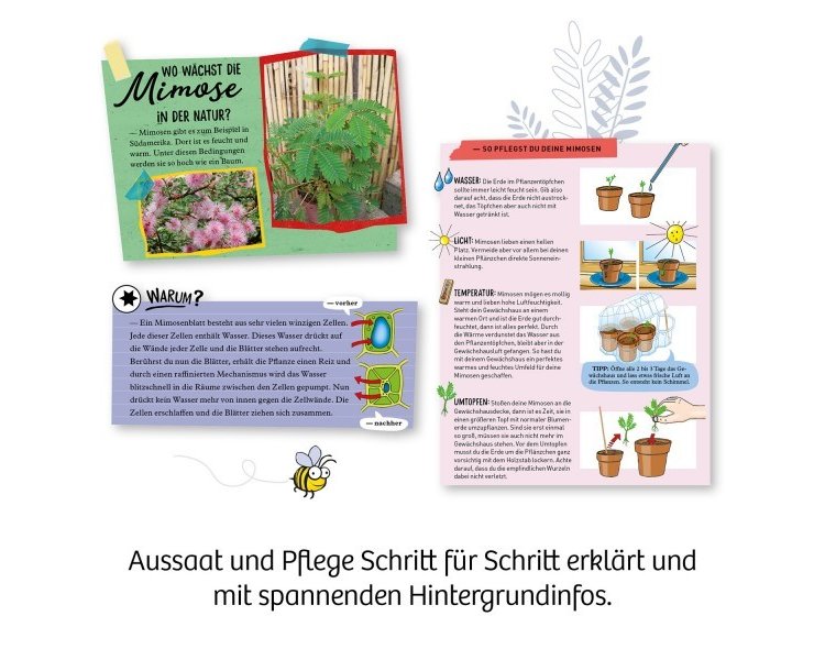 Die anschauliche Anleitung beantwortet Fragen, die auch direkt an den Pflanzen getestet werden können: Was brauchen Mimosen, um zu wachsen? Warum reagieren sie so empfindlich auf Berührungen oder Temperaturen? Mit diesen und weiteren Versuchen ist das KOSMOS Experimentierset eine tolle Überraschung als kleines Geschenk oder Mitbringsel zum Kindergeburtstag.