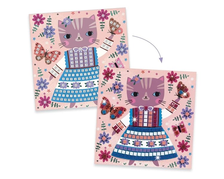 Eine Box, um die Kunst des Mosaiks zu lernen, indem man die Outfits dieser liebenswerten Charaktere verschönert. 4 Bilder zum Vervollständigen mit kleinen Quadraten aus Moosgummi, die einfach aufgeklebt werden. Das Kind sucht die Zahlen und klebt die entsprechenden Teile an die vorgesehene Stelle im Bild. Die Bilder füllen sich und die Figuren erwachen zum Leben.