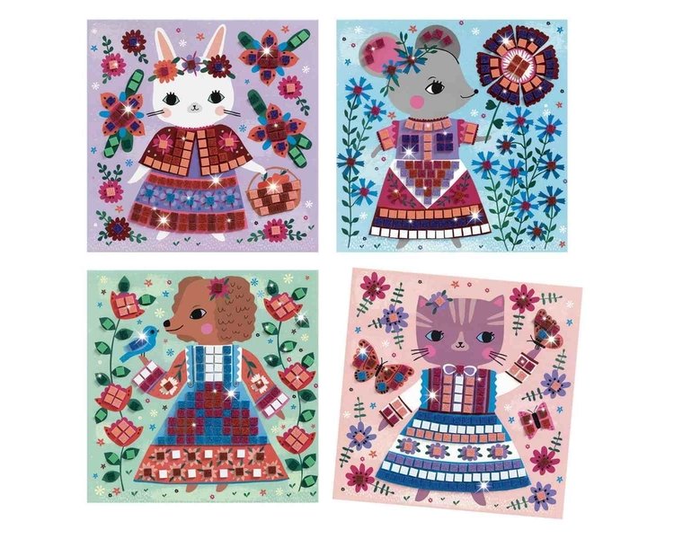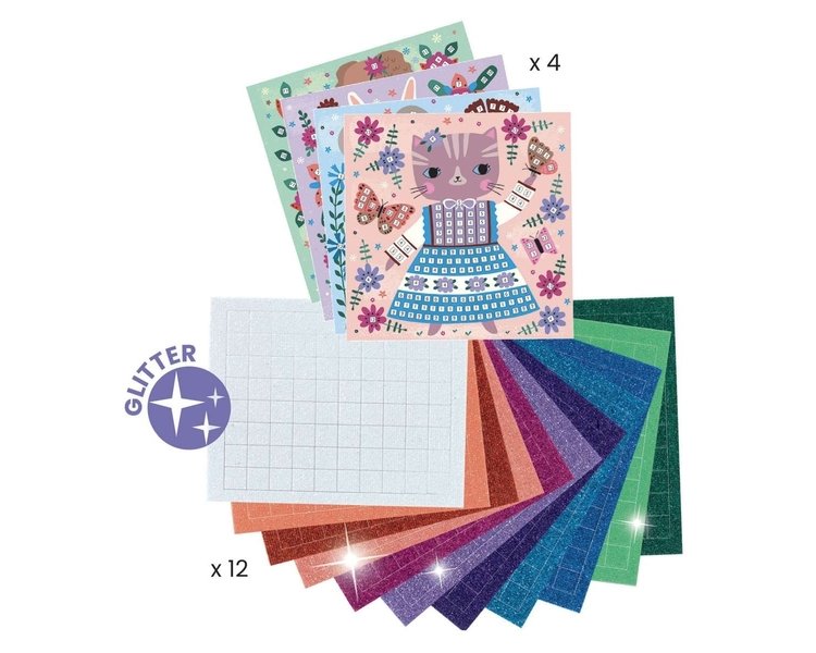 Inhalt: 4 illustrierte Karten, 12 Bögen mit selbstklebenden Quadraten mit metallisch glänzendem Moosgummi, 1 Schritt-für-Schritt-Anleitung in Farbe.