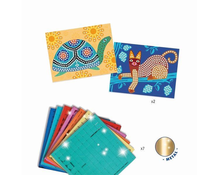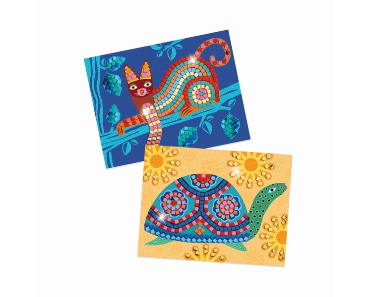 Inhalt: 2 Mosaikvorlagen, 7 Bögen buntes selbstklebendes Moosgummi-Mosaikvierecke in verschiedenen Farben