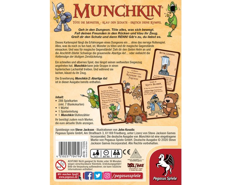 Munchkin, die Munchkin-Charaktere, und das Pyramiden-Logo sind eingetragene Marken oder Handelsmarken von Steve Jackson Games Incorporated in den USA und anderswo und werden von Pegasus Spiele in Lizenz benutzt. Alle Rechte vorbehalten.