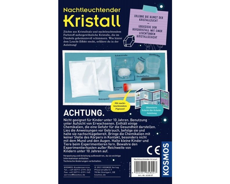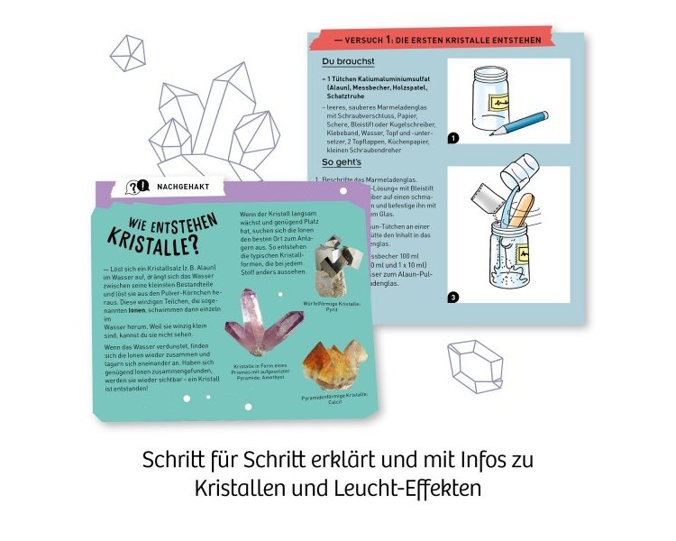 Aber wie entstehen Kristalle eigentlich in der Natur und wo wird nachtleuchtender Farbstoff im Alltag verwendet? All das verrät die Anleitung. So macht Chemie Spaß!