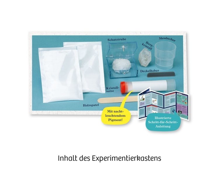Inhalt: 2 Tütchen Kristallsalz (Alaun, je 20g), Glow-in-the-Dark-Mischung (16g), ungeschliffener Bergkristall, Messbecher, Spatel, Schatztruhe, farbig illustrierte Anleitung