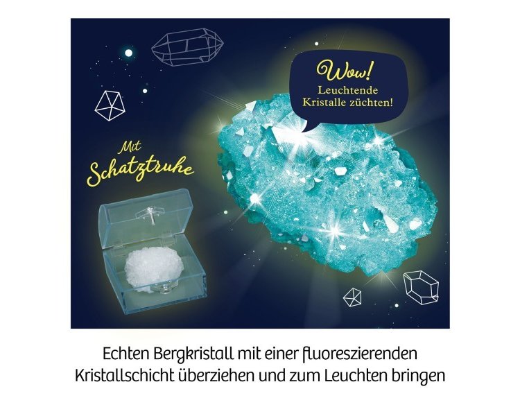 Ein geheimnisvolles, magisches Leuchten im Kinderzimmer! Mit diesem KOSMOS Experimentierset werden Kinder ab 10 Jahren zu erfolgreichen Kristallzüchter*innen. Die Anleitung zeigt ihnen in einfachen Schritten, wie sie aus Alaunpulver funkelnde Kristalle züchten. Die selbstgezüchteten Kristalle werden auf den beiliegenden, großen Bergkristall aufgebracht und bekommen ein Bad in einer Lösung aus nachtleuchtendem Farbstoff. So beginnt das wunderschöne Kristall-Kunstwerk zu wachsen und zu leuchten.