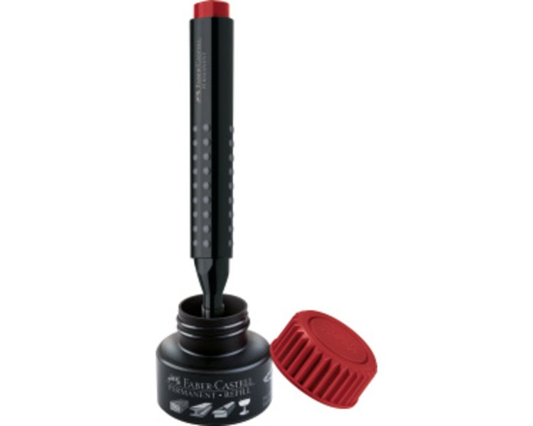 Für die Beschriftung fast aller Oberflächen wie z.B. Glas, Holz, Karton und Metall empfiehlt sich der wetterfeste, lichtbeständige und extrem haftfähige GRIP MARKER PERMANENT mit ergonomischer Dreieckform und echter Noppengriffzone. Wahlweise mit stabiler Rund- oder Keilspitze ausgestattet erzeugt er individuelle Strichbreiten und ist mit wisch- und wasserfester Tinte in den Farben Rot, Blau, Grün und Schwarz erhältlich. Leicht nachfüllbar mit dem Tintenfass Refill PERMANENT 1505.