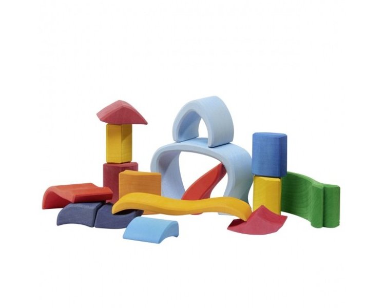 Bunt, kreativ, einzigartig. Die Formen sind aus hochwertigem Lindenholz hergestellt und ergeben eine besondere Haptik durch die gebeizten Oberflächen. Freie Bauweisen in allen möglichen Traumwelten lassen Kinder und Eltern zu individuellen Baumeistern werden. 16-teilig, ca. 19x6x20cm (lxbxh).