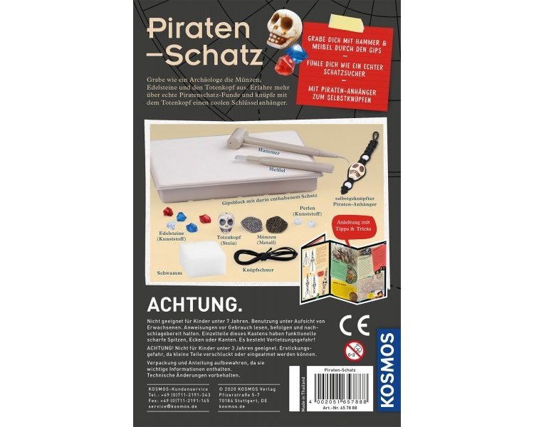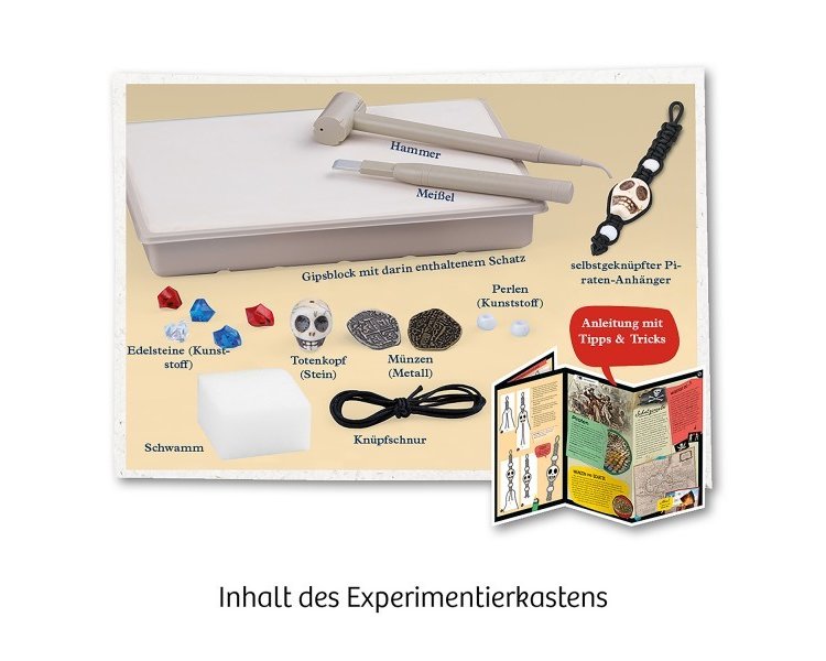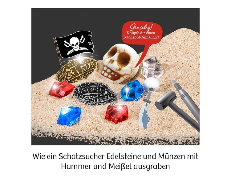Ein versteckter Piratenschatz wartet in einem Gipsblock darauf, entdeckt zu werden! Mit Hammer und Meißel machen sich Mädchen und Jungen voller Abenteuerlust auf die Suche nach Münzen, Perlen und bunten Steinen – und sogar ein Totenkopfanhänger ist unter der Beute!