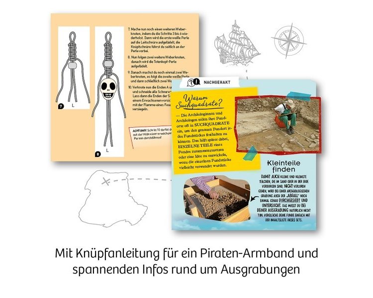 Die farbige Anleitung zeigt genau, wie man als Archäologe beim Ausgraben systematisch vorgeht und verrät zusätzlich Wissenswertes über Piraten und ihre Schätze.