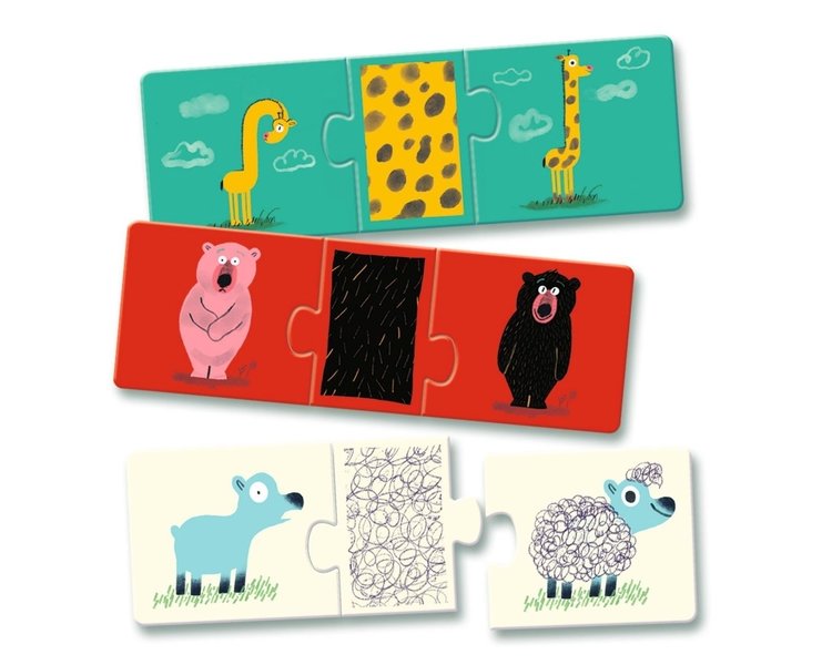 Trio-Puzzle Tout nu ist ein humorvolles Puzzle, bei dem ein „ganz nacktes" Tier mit seinem Fell, seinem Gefieder, seinen Punkten usw. kombiniert wird, um sein gewohntes Aussehen wiederzufinden.
