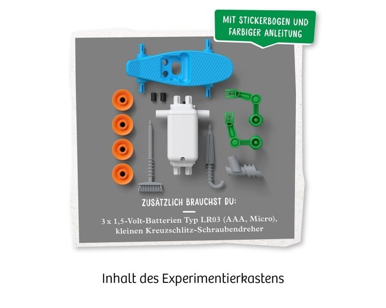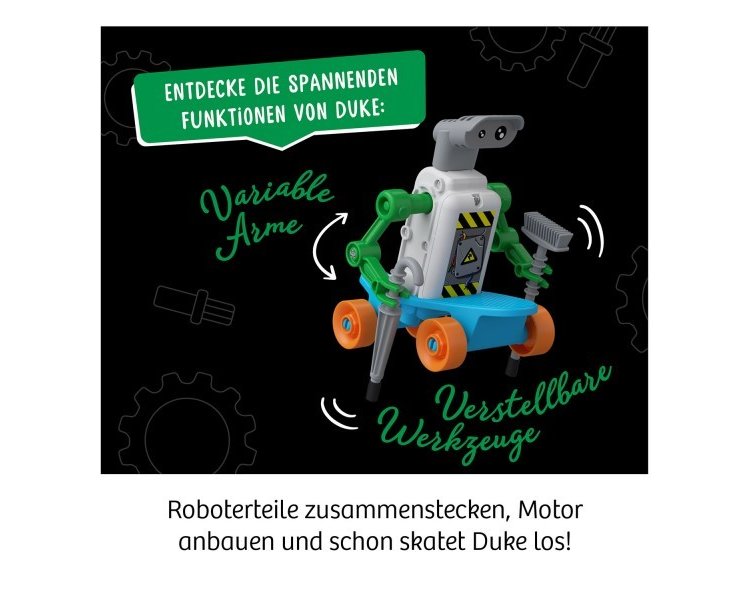 Aus der Bahn, hier kommt der coole Skater! Aus wenigen Einzelteilen und mit schnellen Klicks bauen Kinder ab 8 Jahren einen rollenden Roboter von KOSMOS zusammen. Schon düst er wild durchs Zimmer. Mit Schirm, Besen und Skateboard ausgestattet, ist bereits das Äußere des ReBotz etwas ganz Besonderes. Einfach der anschaulichen Anleitung folgen, Motor und Batterien einbauen und schon setzt sich der Roboter in Bewegung. Mit den variablen Armen wird jedes Mal neu bestimmt, wie Duke drauflos skatet.