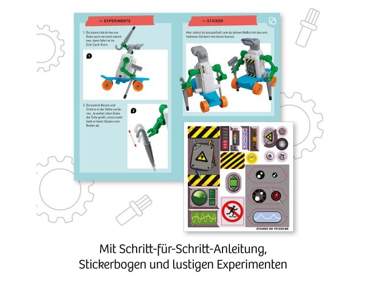 Die Anleitung liefert Ideen, wie die ReBotz-Bauteile kombinierbar sind und zeigt, wie mit kleinen Experimenten die Bewegung der Robos geändert werden kann.