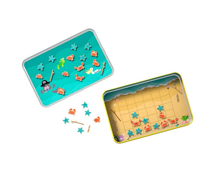 Inhalt: 2 Magnet-Spielpläne, 2 x 15 magnetische Meeresbewohner, 7 Stöcke, 1 Spielanleitung.