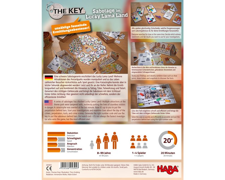 Eine schwere Sabotageserie erschüttert das Lucky Lama Land! Mehrere Attraktionen des Freizeitparks wurden manipuliert. Beim detektivischen Krimispiel The Key – Sabotage im Lucky Lama Land von HABA nehmen die Spieler die Ermittlungsarbeit auf und kombinieren die Hinweise zu Tattag, Täter, Tatwerkzeug und Tatort. Am Ende müssen sie den richtigen Zahlencode generieren und bringen so die Saboteure mit dem Schlüssel hinter Gitter. Beim HABA Spiel The Key – Sabotage im Lucky Lama Land gewinnt nicht unbedingt der schnellste, sondern der effizienteste Ermittler. Da jede Spielrunde anders verläuft, ist der Wiederspiel-Reiz besonders hoch. Als Solo-Variante lässt es sich auch alleine spielen.