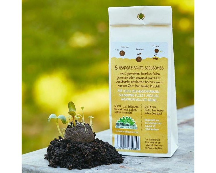 5 handgemachte Samenbomben der Sorte let it BEE. Auf diese Bienenschmankerl fliegt auch die anspruchsvollste Biene. Enthält unter anderem Goldgarbe, Bienenkraut, Lupine, Salbei & Lavendel.