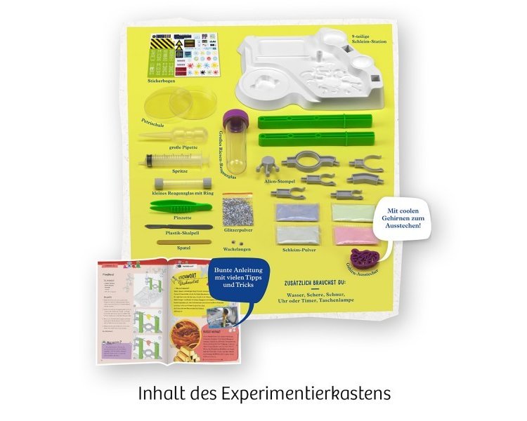 Inhalt: Verschiedene Schleimsorten, Ausstecher, Tubes, Alien-Stempel, Schleim-Station, Glitzerpulver, Wackelaugen, Skalpell, Pinzette, Pipette, Spritze, Sticker-Bogen