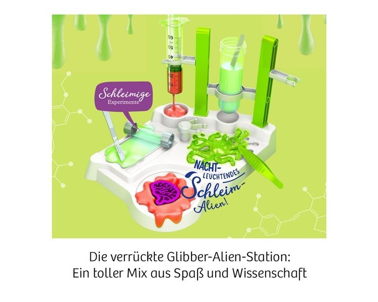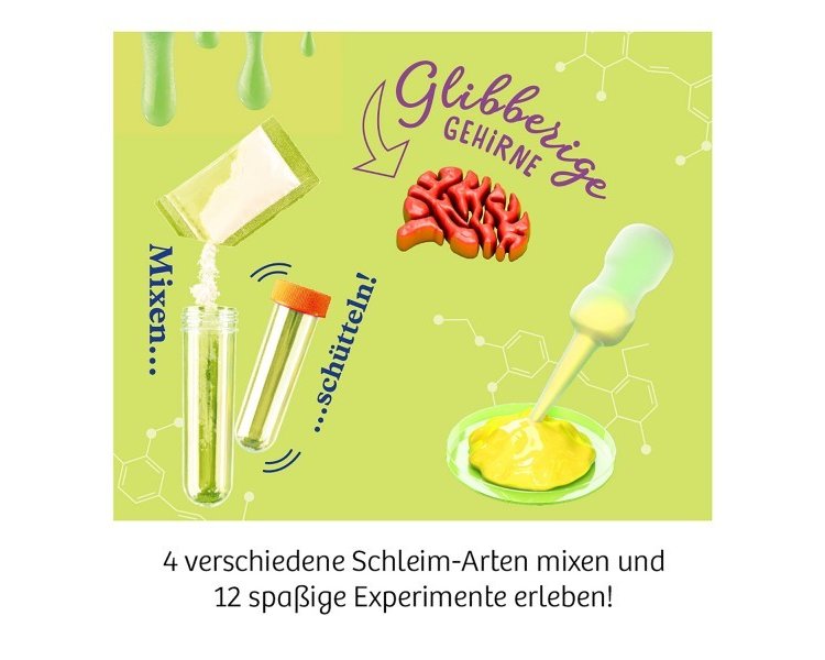 Nachtleuchtendes Schleim-Alien, Farbwechsel-Schleim, glibberige Gehirne einfach selber machen – Schleim in allen Formen und Farben gibt es im Experimentierkasten „Schleim-Labor“ von KOSMOS. An der Station aus robustem Kunststoff führen Kinder von 8 bis 13 Jahren tolle Experimente mit Pipette, Petrischale, Messbecher, Reagenzglas und Co. durch. Anrühren, ausrollen, ausstechen, durch eine Spritze drücken – mit diesem ganz besonderen Glibber-Material wird Laborarbeit zum großen Spaß und ganz nebenbei lernen die Kinder den richtigen Umgang mit ihren ersten Labor-Utensilien kennen.