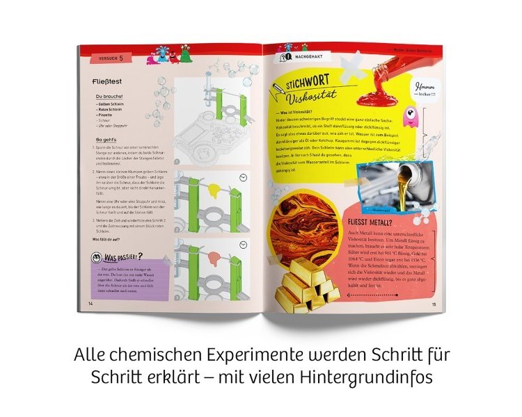 Die Anleitung führt mit einer spannenden Alien-Forschungsmission Schritt für Schritt durch die Experimente, und altersgerechte Info-Texte erklären erste chemische Grundbegriffe.