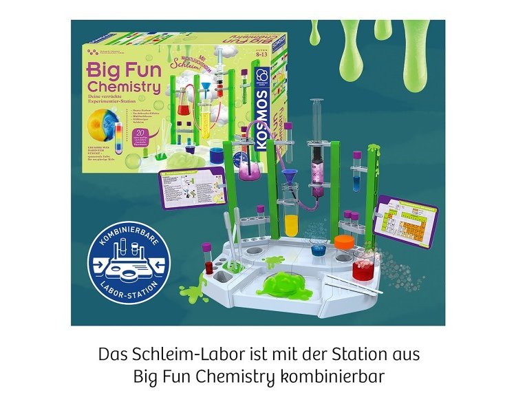 Coole Spiel- und Labor-Welt: Der Experimentierkasten „Schleim-Labor“ ist mit der großen „Big Fun Chemistry“-Station von KOSMOS kombinierbar.