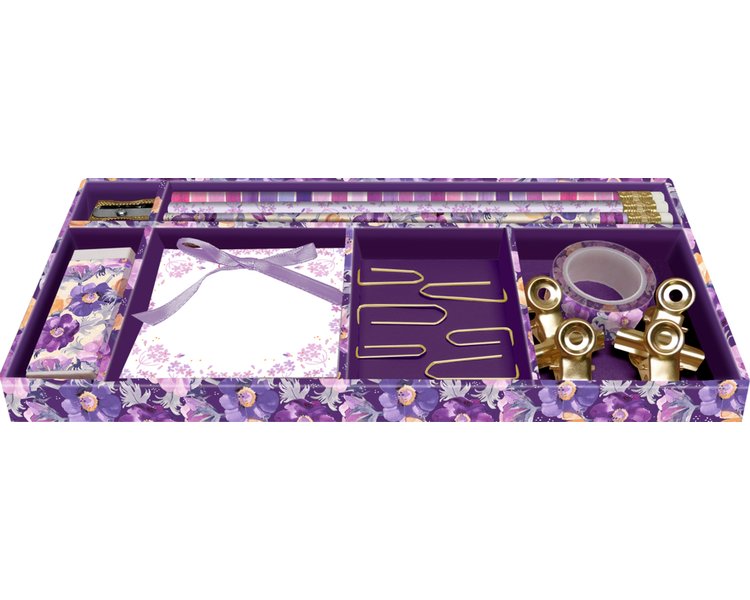 Wunderschönes und praktisches Schreibset aus der Serie "All about purple", das alle wichtigen Schreibutensilien enthält: 3 HB-Bleistifte, Anspitzer, Radierer, Notizblock, 6 Büroklammern, 4 Metallklemmen, Masking-Tape. Perfekt fürs Büro, die Schule, Uni oder das Home-Office.