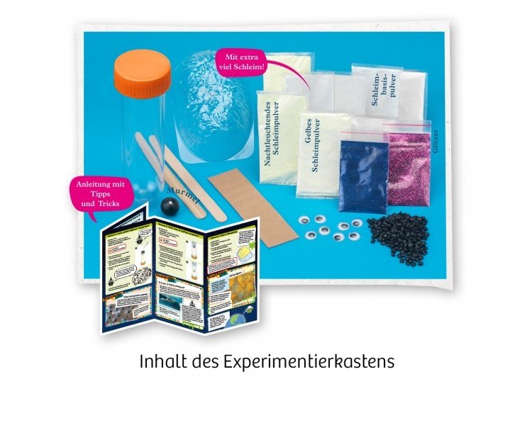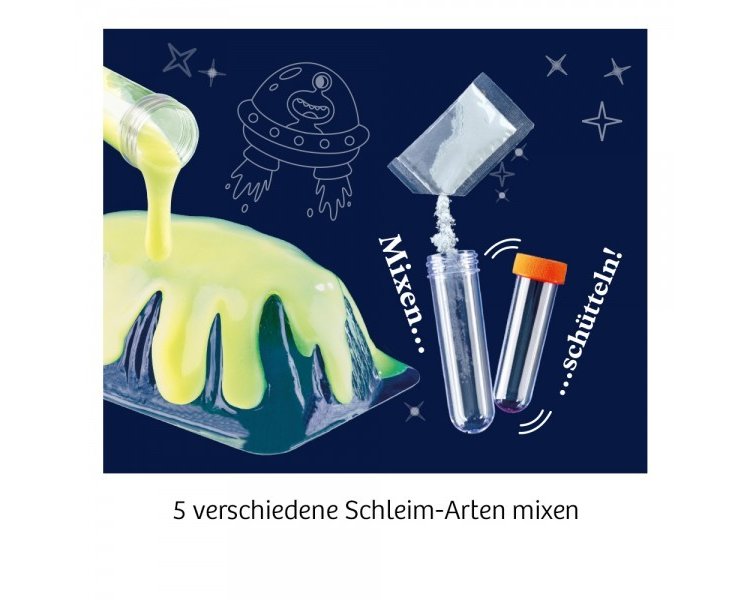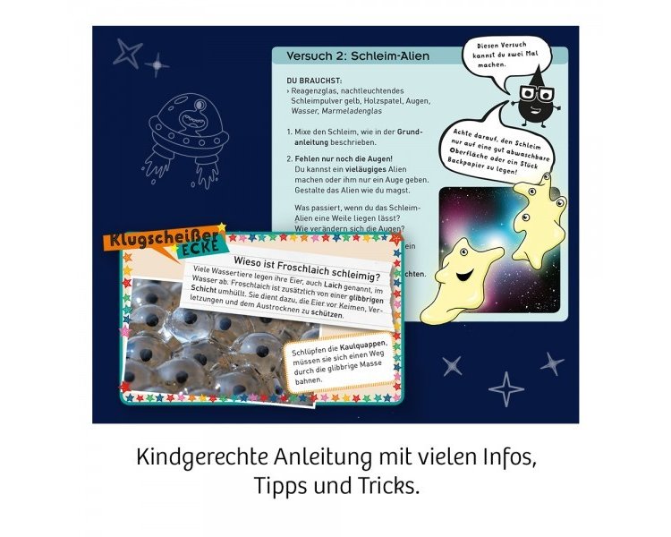 In 6 spannenden Experimenten werden Highlights wie nachtleuchtender Galaxie-Schleim, wandernde Schleimpilze, Glitzerschleim und ein waberndes Schleim-Alien mit Augen einfach hergestellt.