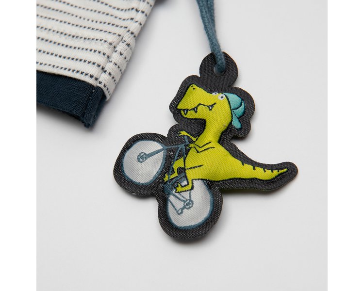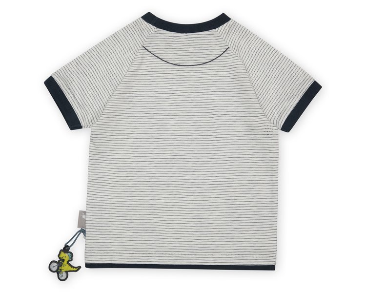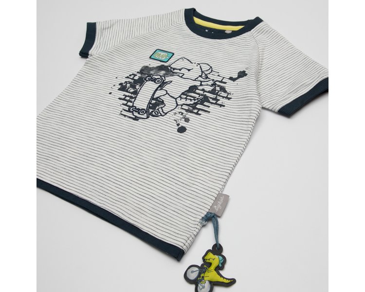Was bei diesem Jungen T-Shirt wie Streifen aussieht, ist ein eingewirktes Pünktchenmuster. Auch das Motiv ist einen zweiten Blick wert, denn der fröhliche Dino und sein Skateboard sind gestickt mit einem Relief Print als Hintergrund. Das Sommershirt aus Slubjersey hat extra weiche Bündchen an Ärmeln und Hals, einen unterlegten Saum und noch einen Patch als Farbtupfer. Aus reiner Bio-Baumwolle.