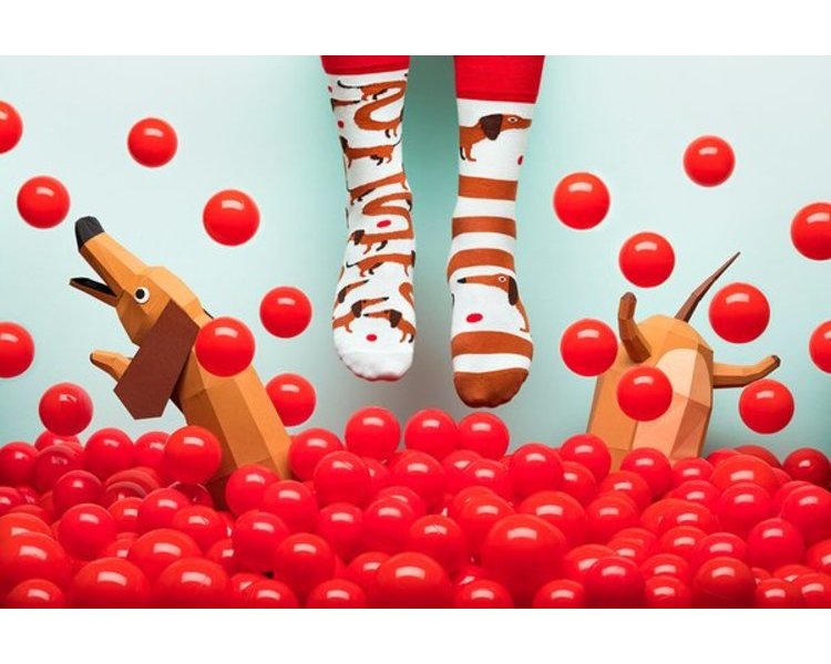 Dackelsocken in Braun, Rot und Weiß. Hundesocken zaubern ein Lächeln auf jedes Gesicht!