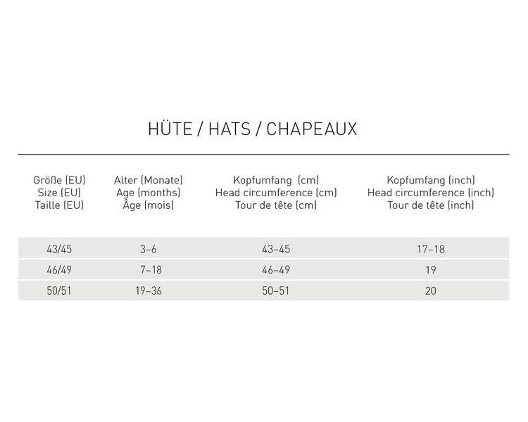UV-Strahlung führt bei zu langer Belastung zu Sonnenbrand und Hautschäden. Dieser Sonnenschutz-Hut schützt nur den bedeckten Bereich, andere der natürlichen UV-Strahlung ausgesetzten Körperteile müssen gesondert geschützt werden, z.B. durch Auftragen von Sonnenschutzmitteln und Tragen von weiterer UV-Schutzkleidung. Diese Kopfbedeckung bietet keinen Schutz vor reflektierter oder gestreuter ultravioletter Sonnenstrahlung. Die tatsächliche Schutzdauer der UV-Schutzkleidung hängt von der Hautbeschaffenheit des Kindes sowie der Intensität der Sonneneinstrahlung ab. Der ausgewiesene UV-Schutz kann sich verringern durch normalen Verschleiß sowie an den Nähten. Bei Beschädigungen und Verschleiß bitte Sonnenschutzhut austauschen oder fachgerecht reparieren lassen. Die Haltbarkeit der Schutzkleidung beträgt - auch ohne sichtbare Beschädigungen - 6 Jahre ab Produktionsdatum.