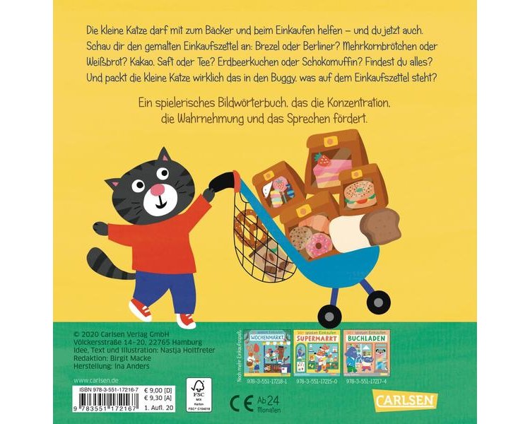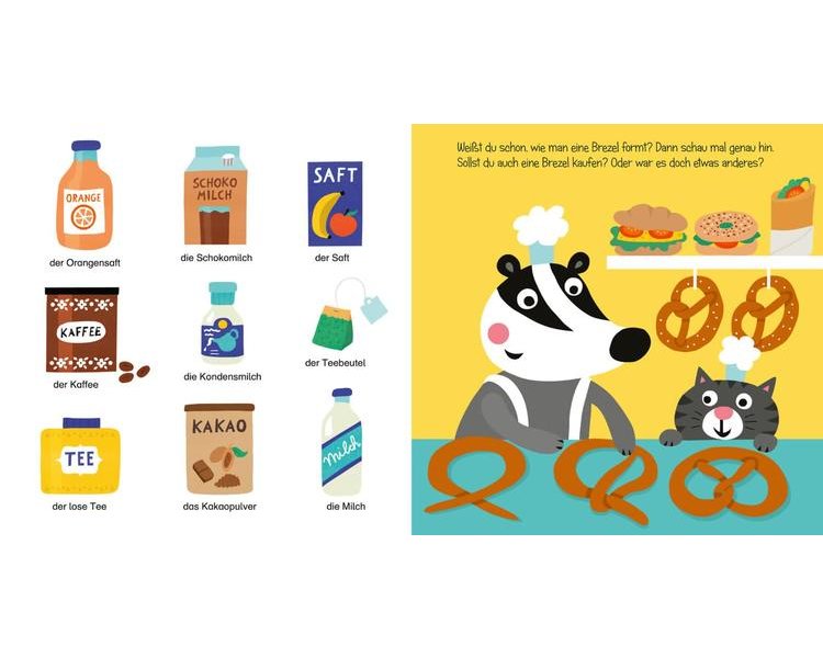 An diese greifbare Erfahrung knüpft das lustige Mitmachbuch an. Hier gilt es, die Bildchen auf dem Einkaufszettel zu Beginn gut anzuschauen und dann von Seite zu Seite mit der kleinen Katze durch den Laden zu gehen und Brötchen, Brot, Brezel, Kuchen, Kakao, Minipizza und noch mehr zu entdecken und einzukaufen.