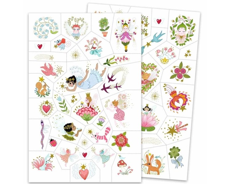Zwei Bögen mit temporären Tattoos zum Thema Feen. Zur größten Freude der Kinder sind sie mit kleinen goldenen Details bestreut! Für eine einfache Anwendung sind sie vorgestanzt und werden mit etwas Wasser aufgetragen. Dermatologisch getestet.