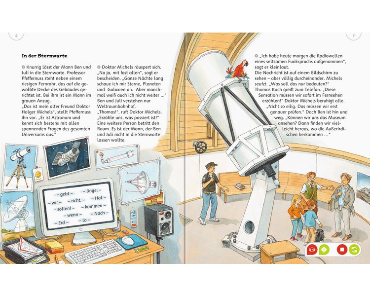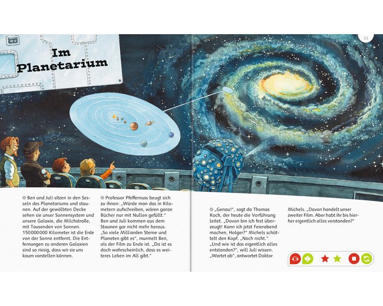 Juli, Ben und Professor Pfeffernuss befinden sich im Weltraumcamp, als die Mitarbeiter eine seltsame Nachricht erhalten. Stammt sie von Außerirdischen? Juli und Ben begeben sich auf die Suche. Irgendwo zwischen Sternwarte, Planetarium und Weltraummuseum muss es doch einen Hinweis geben ... Eingebettet in eine spannende Geschichte erfahren junge Leser nicht nur Wissenswertes über unsere Galaxie, sondern auch über Astronomen und Astronauten.