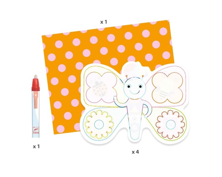 Inhalt: 4 illustrierte Silhouetten-Vorlagen aus weichem Kunststoff mit einer weißen Fläche, die wie von Zauberhand verschwindet, ein Stift mit Wassertank und 1 Unterlage aus dickem Karton.