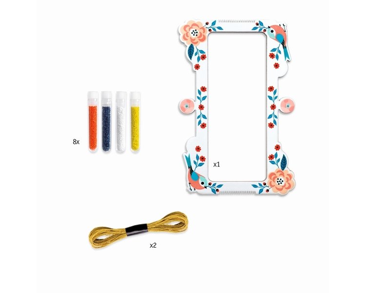 Das Set enthält neben dem Webrahmen, 8 Perlenröhrchen in verschiedenen Farben und, 2 Fadenstränge.